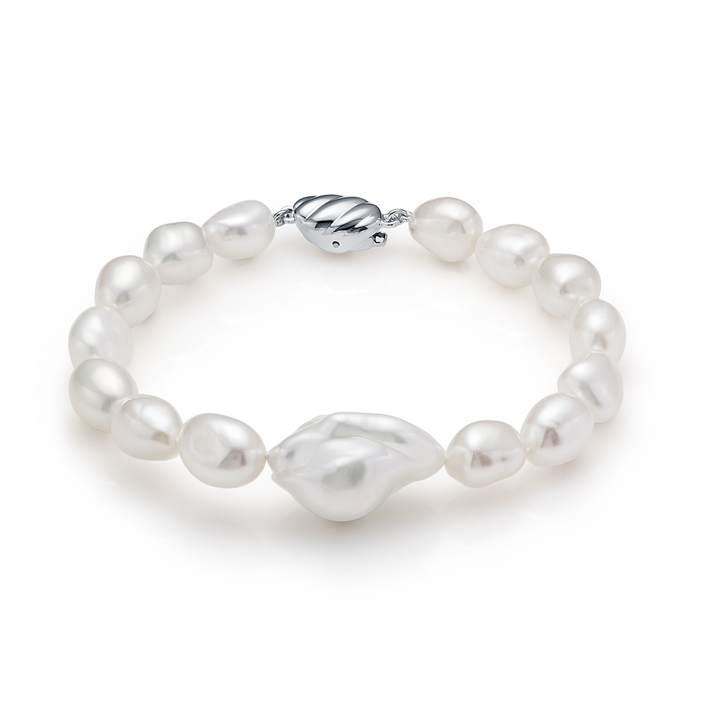 Браслет из серебра с белой барочной жемчужиной 8-9 мм. Качество — наивысшее ААА. Артикул 12821