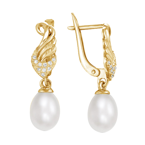 Серьги из золота 585 пробы украшены каплевидными пресноводными жемчужинами белого цвета.
