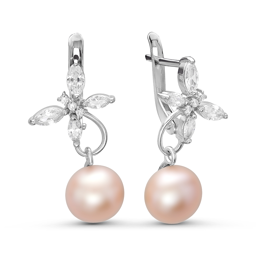Серьги серебряные с розовым жемчугом 9,5-10 мм. Артикул 10400