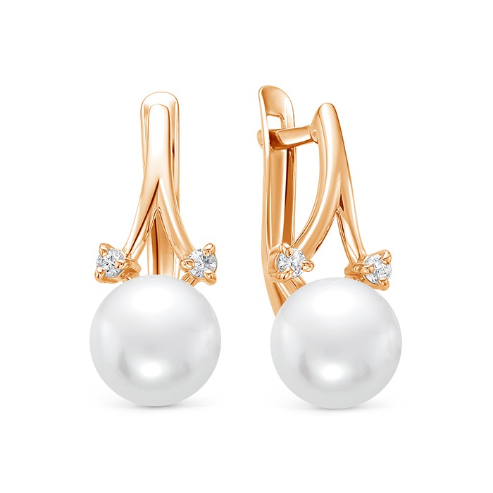 Серьги из красного золота с белыми жемчужинами 9,5-10 мм. Артикул 12851
